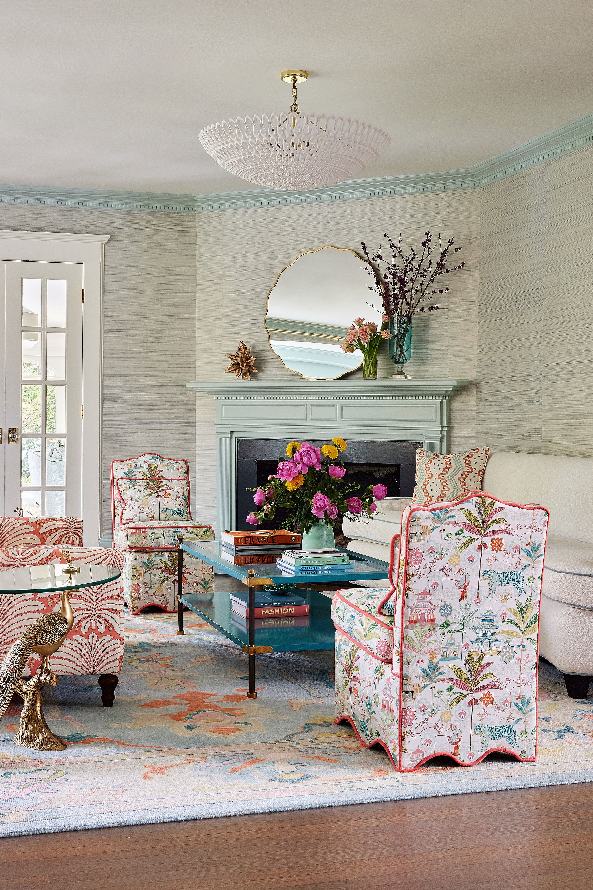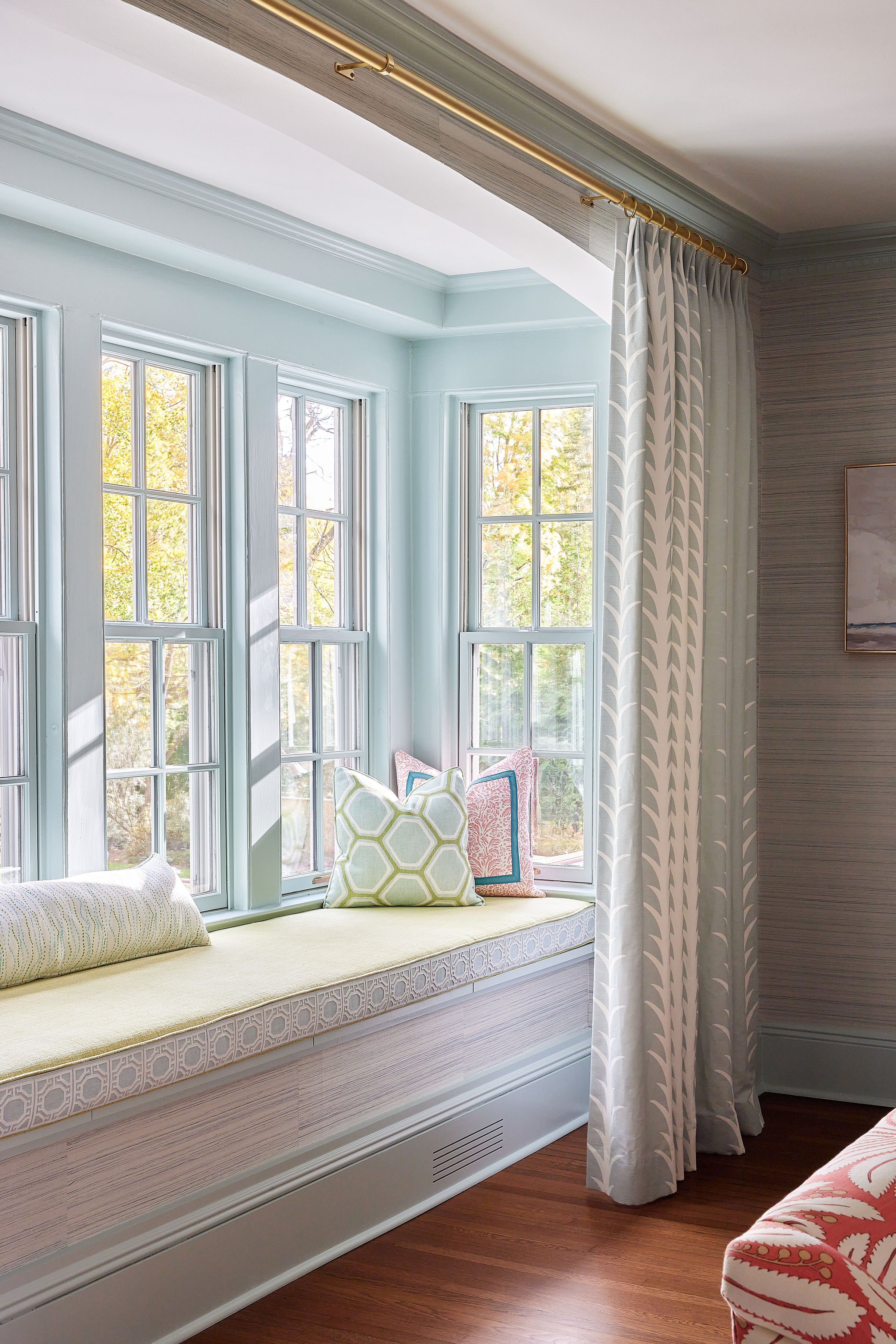 The living room was designed for entertaining. Boasting plenty of seating - from a curvy sofa to scalloped slipper chairs and extra long window seat - guests are welcome to sit and stay a while. The custom-made Oushak rug pulls in ALL the colors to ground the space and add a pop of fun. We wanted to create a space that felt light, colorful and not too precious.