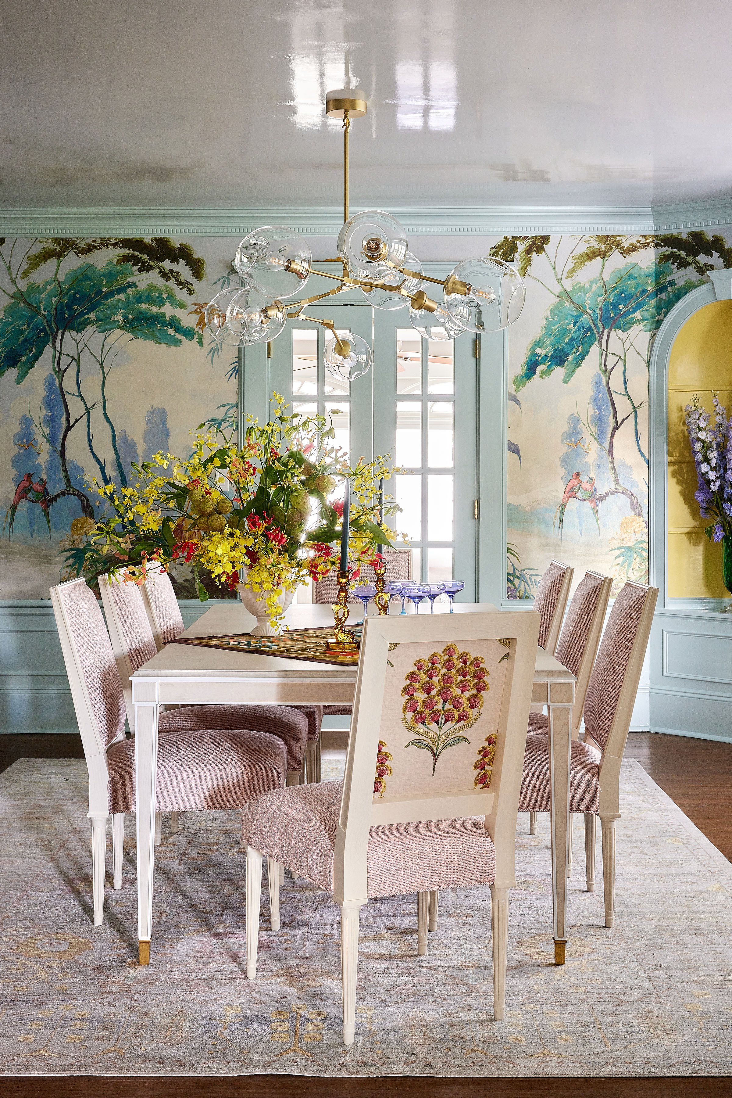 Peacock blue velvet drapery panels with bold trim on the leading edges are striking against the chinoiserie mural