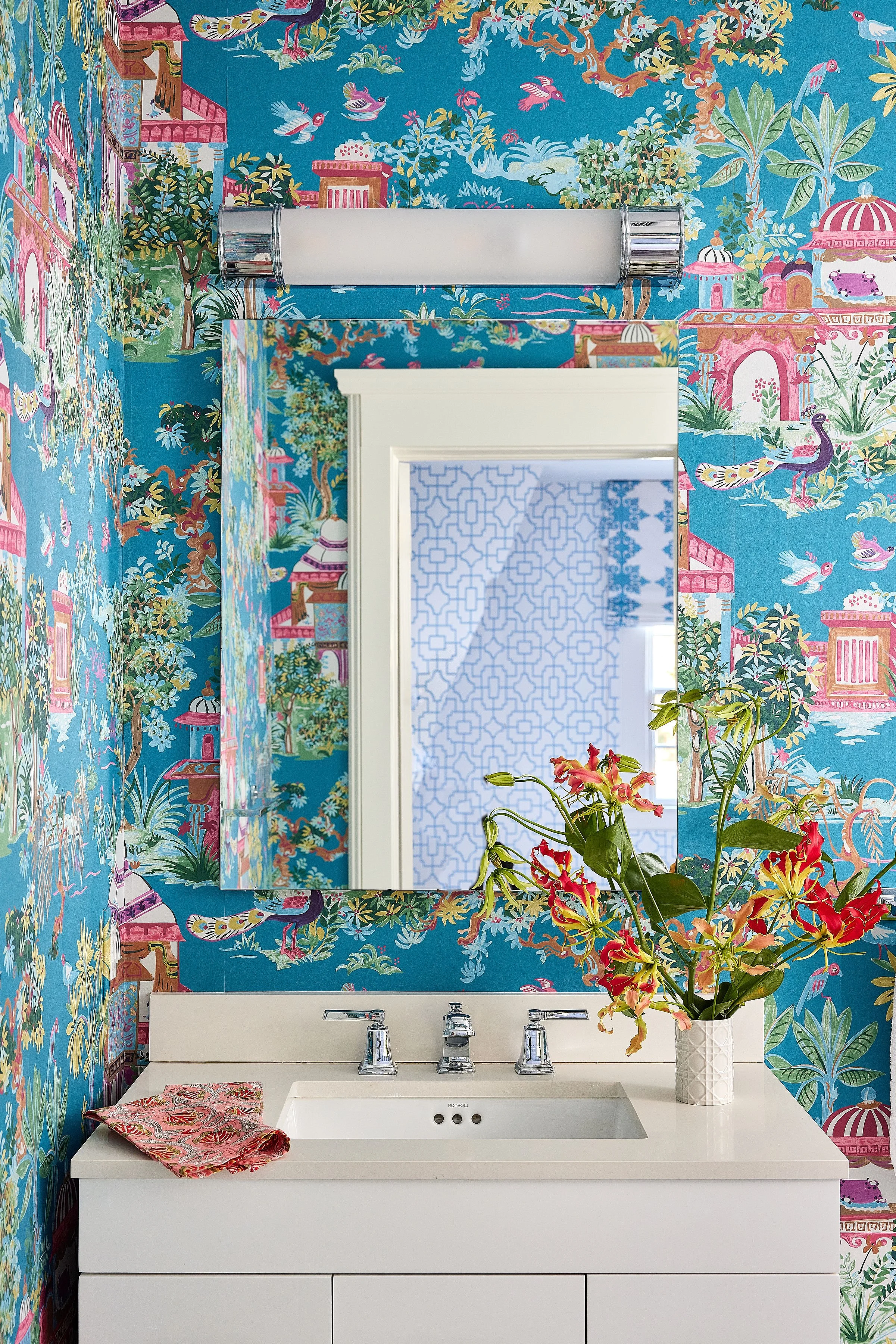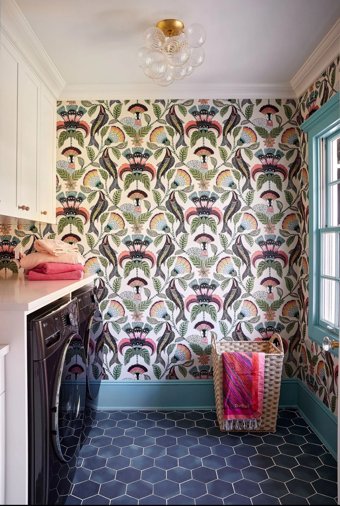 The laundry room was carved out of a former closet and is a true showstopper. Whimsical wallpaper, bubble lighting and honeycomb floor tiles make the never-ending task of washing and drying a joy.
