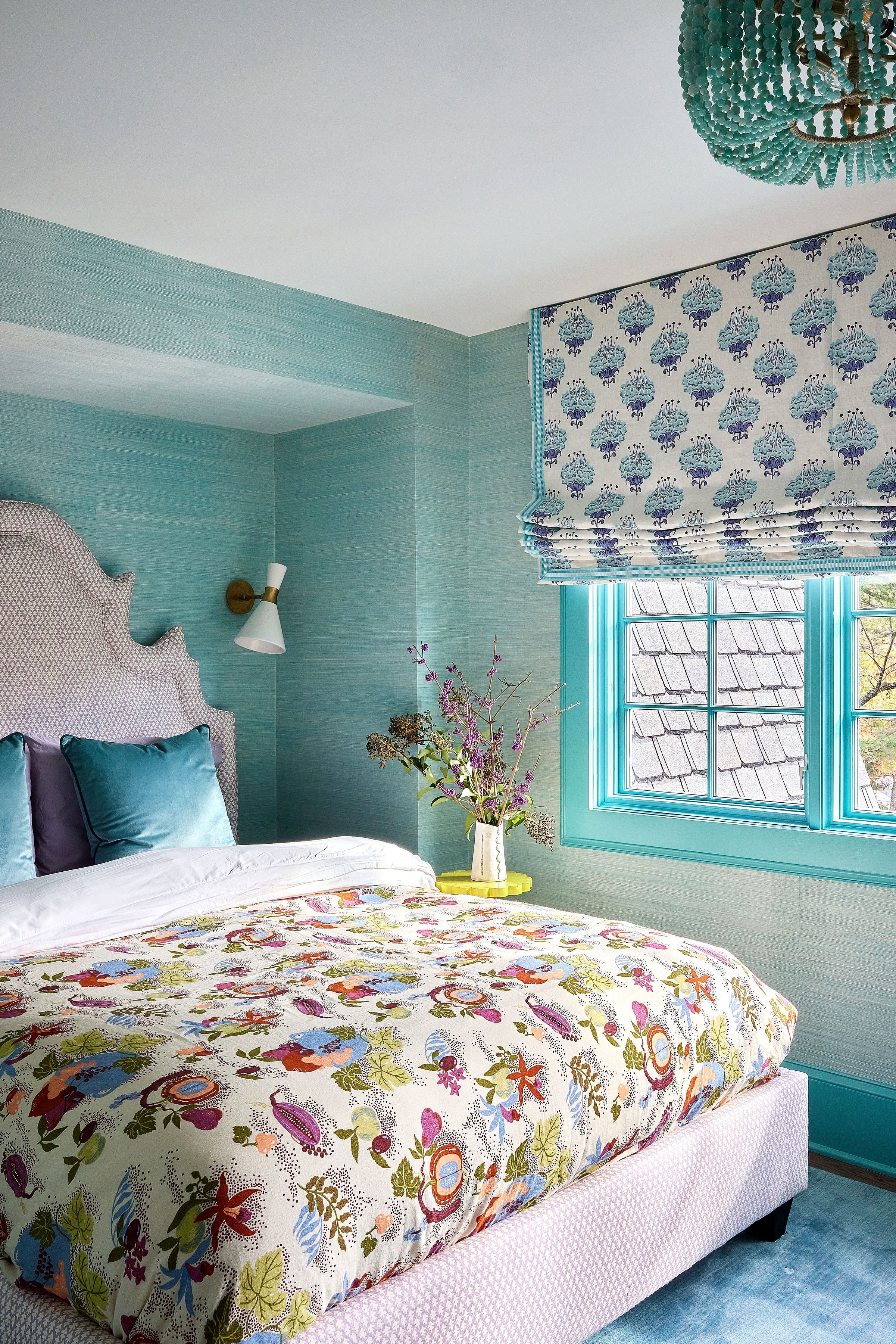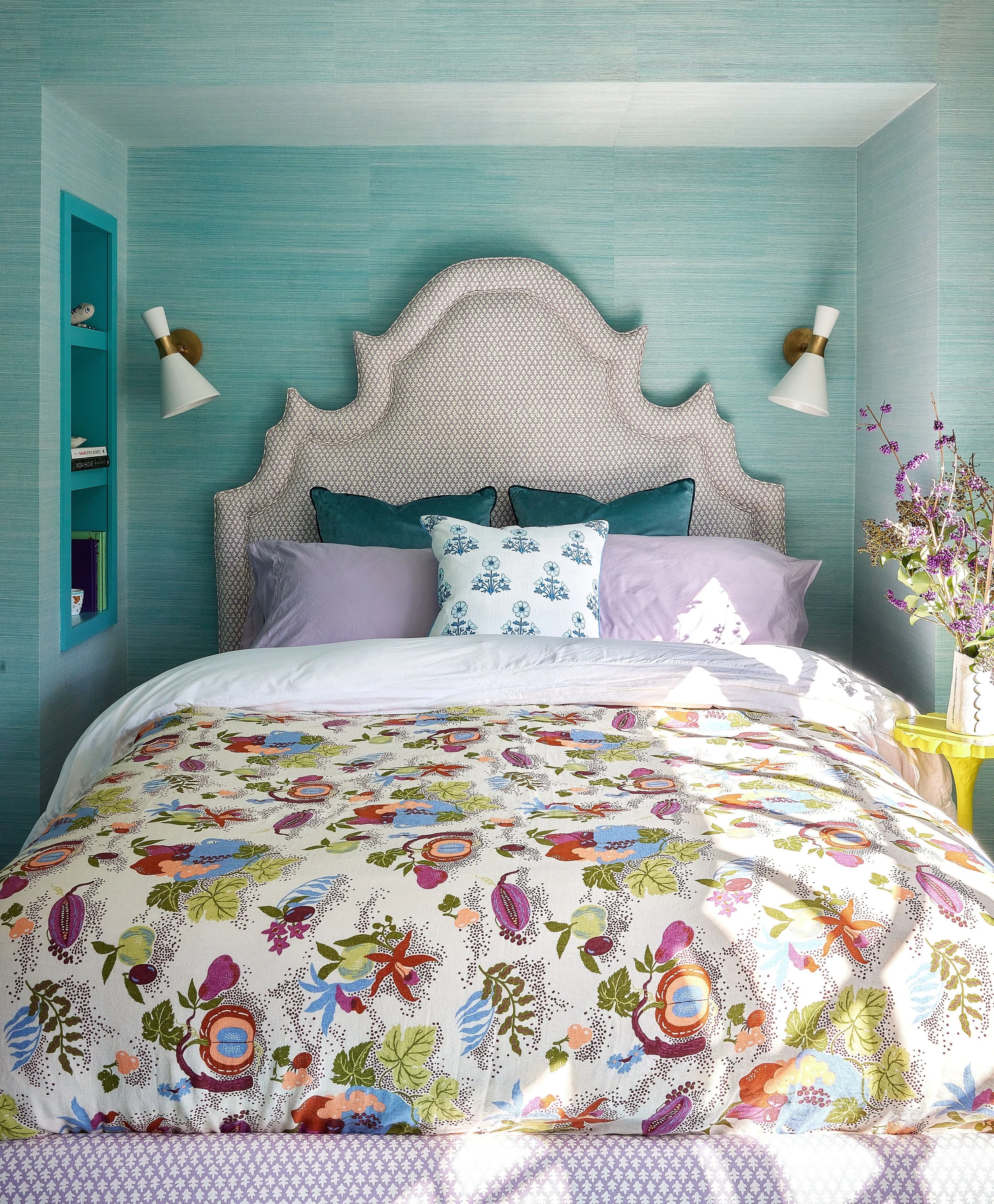 Grasscloth walls wrapped in aqua, paired with lavender = a little girl’s dream bedroom
