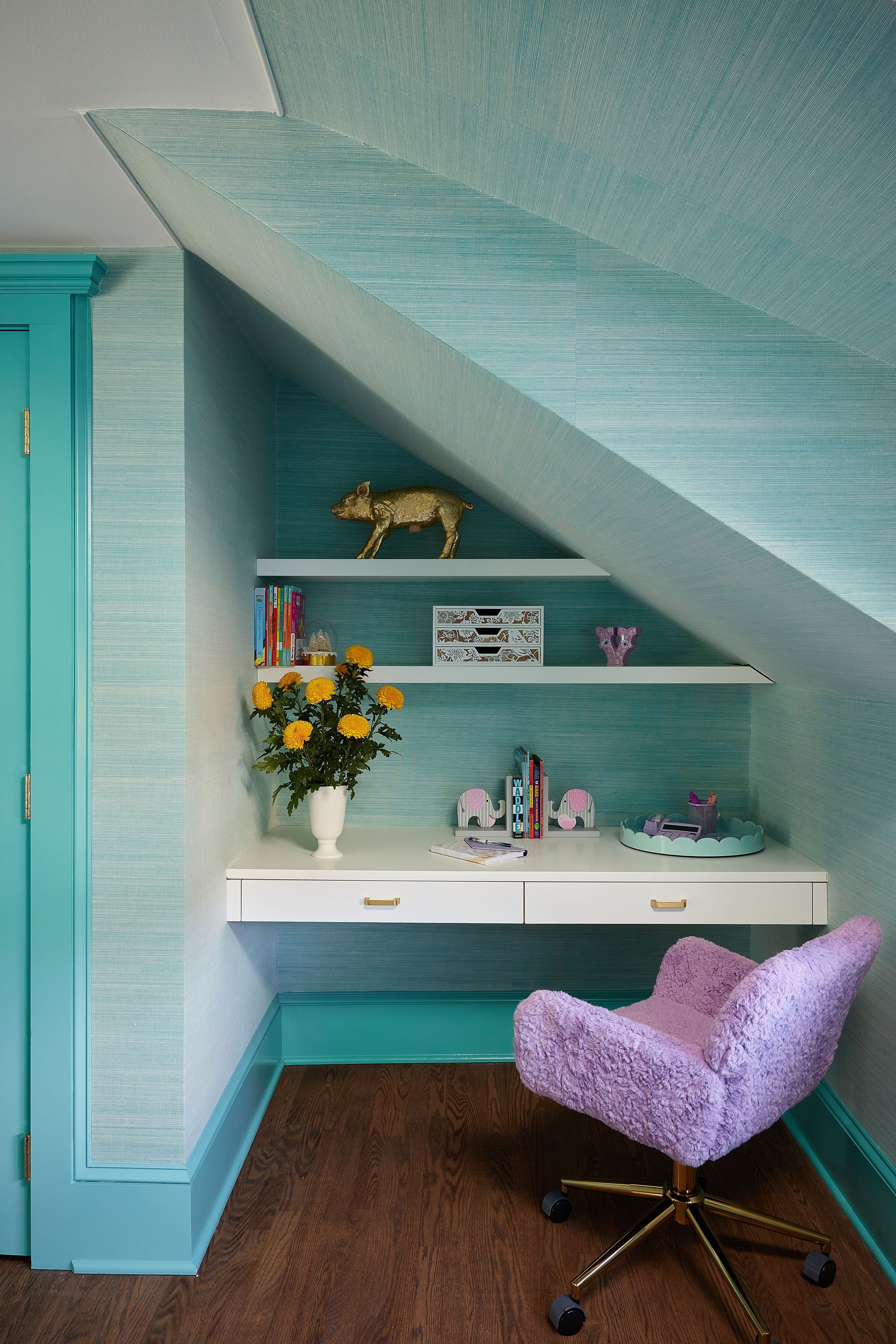 This girl’s bedroom had a clear color directive: Aqua and Lavender. So we wrapped the walls in this watery hue and designed a ‘swoops and curvy’ headboard upholstered in the softest of linen. We carved out a desk within the awkward angles in the adjacent room - making it a perfect nook to do homework.