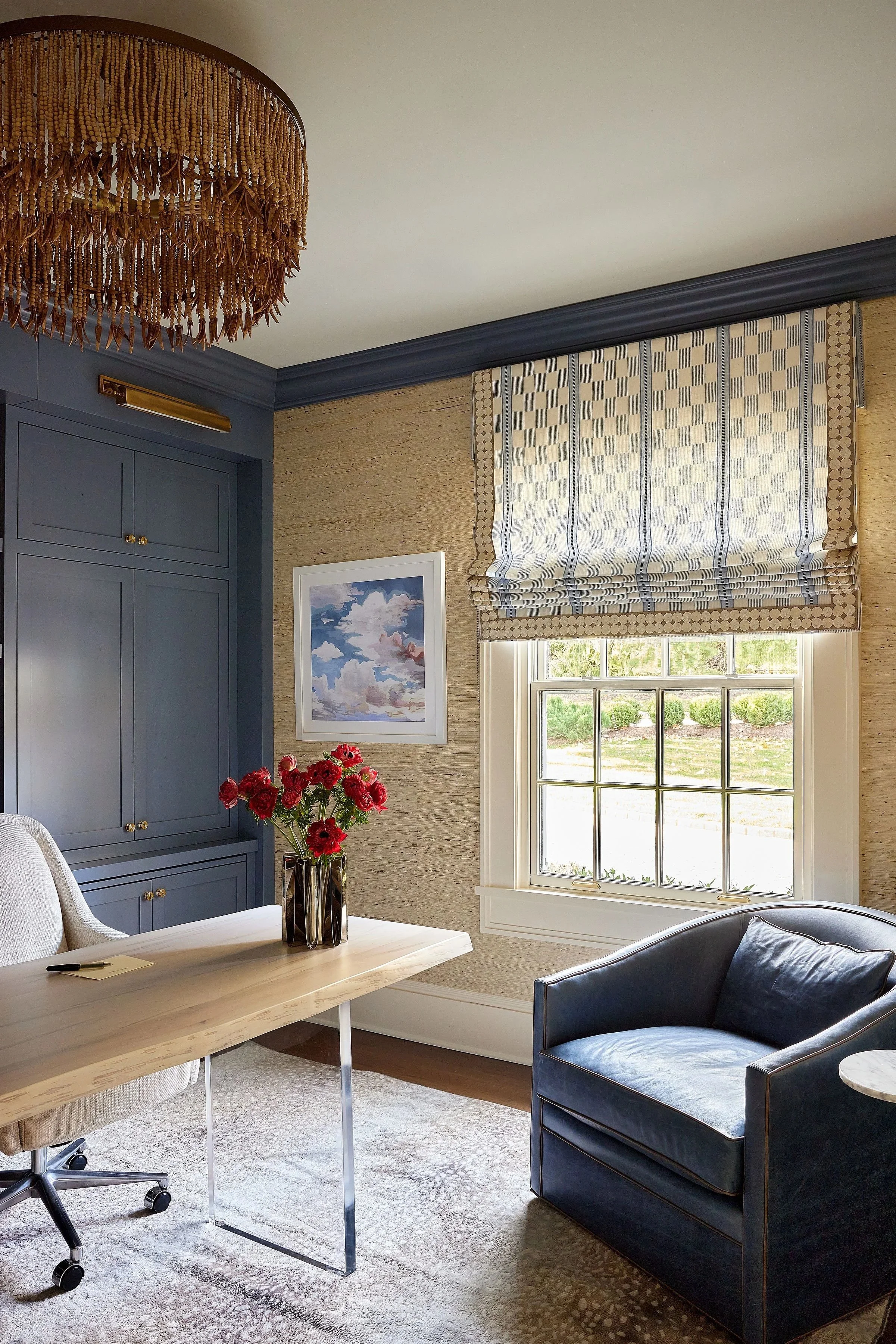 A custom bookcase was built to accommodate multiple monitors, a separate pull out desk, and picture frame lighting. Wrapped in a nubby raffia grasscloth and finished with a beaded chandelier, this office feels like an escape from the daily grind.